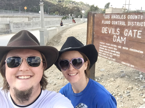 Charly Shelton and Sabrina Walentynowicz stopped at Devil’s Gate Dam, one of the many locations that are showcased in the book, “10,000 Steps a Day in LA.”