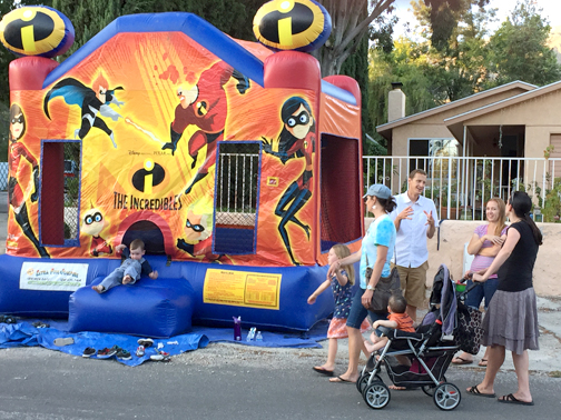 Children on Los Olivos in La Crescenta enjoyed a bounce house while their parents talked.