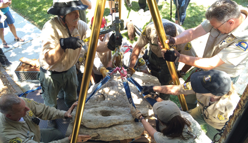 Members of the Montrose Search and Rescue team surround the fossil of the baleen whale gently lifting it with the Arizona Vortex.