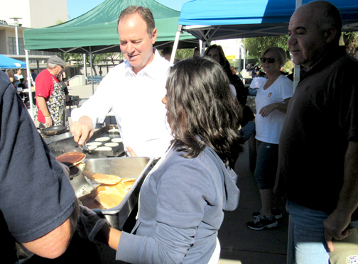 Congressman Adam Schiff stopped by the pancake breakfast and was put to work flipping flapjacks.