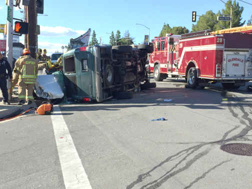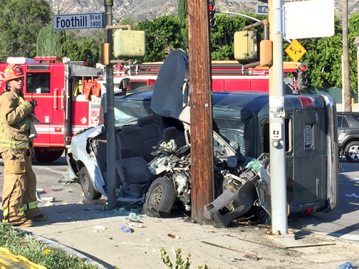 At 3:38 Wednesday afternoon, Glendale Police Dept. received a call of an overturned van, according to Tahnee Lightfoot, spokeswoman for GPD. When they arrived on the scene they realized there was another silver compact vehicle crushed between a utility pole and the van. The driver of the van was traveling southbound on New York Avenue and apparently ran a red light and lost control of his vehicle hitting the silver compact that was traveling westbound on Foothill Boulevard.