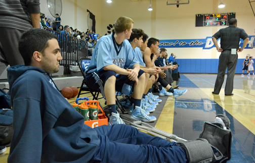 Krikorian went down near the Burroughs bench in the first quarter and did not return. He was in a boot for Monday’s game and supported his teammates from the bench.
