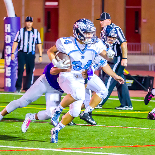 Crescenta Valley Sophomore Joe Suh (No. 34) outmaneuvers Hoover’s defense.