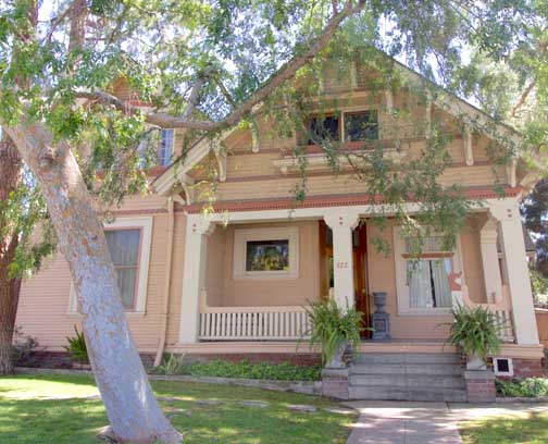 Finally, the Beggs House, a lovely two-story Airplane Bungalow/Craftsman built in 1915, was moved to its current location in 1925. The house, which has been nominated to the Glendale Register, retains many original period details throughout. It has a shallow front gable roof with vertical wood slat gable vents that extend over a large porch supported on substantial square columns set on unusual ruffle brick pedestals connected by a wood banister.