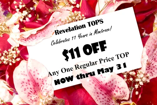 Over at Revelation Tops (2321 ½ Honolulu Ave.), May is an exciting month, celebrating 11 years in Montrose with $11 off on a new top. That means one of your $40 tops is only $29 when you mention this ad. Revelation is ready for summer and has all the latest fashion trends covered including Radiant Orchid, beach themes, lace, crochet and the best fitting jeggings on the planet. Mary and Carole use color, body typing and style to help you look great for Mother’s Day.