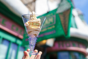 The cold version is an old standby – the classic taste of the land since opening in 2009, the frozen version is refreshing on a warm Hogsmeade day, and the hot butterbeer is a comforting cup of cheer, perfect for those brisk evenings, especially around the holidays. Whichever one you choose, be it a drink version or one of the other treats, you can’t miss. Honestly, it’s hard to beat a cold glass of butterbeer on a warm spring day, but that doesn’t mean it can’t have an accompaniment of the same flavor in the form of ice cream.