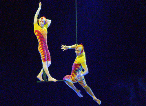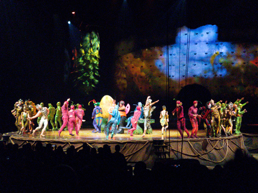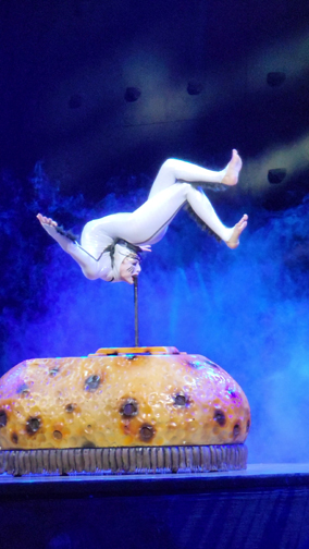 While we in the audience are sitting comfortably in our seats, these amazing performers jump and spin and twirl their way through a story that is based loosely around an egg. OVO. The story follows a wanderer bug that carries a giant egg on his back. When another group of bugs sees that the egg might be valuable, they swindle him out of his egg. Various acts follow, taking place between vignettes of the story of the wanderer bug trying to win back his egg. In the process, he falls in love with a beautiful ladybug that plays hard to get at first but eventually succumbs to his charms. The acrobatic acts don’t necessarily have anything to do with the story, but do provide a nice narrative to track while the stagehands and acrobats set up the transitions from one set to another.