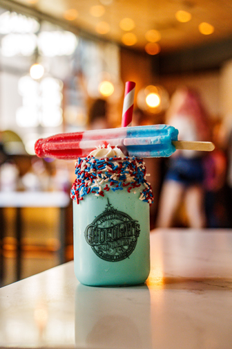 And the newest addition to the menu, the Rocket Pop Milkshake, is a celebratory special edition in honor of the 30th anniversary of CityWalk – vanilla ice cream with buttercream frosting, blue raspberry and strawberry syrups, red white and blue sprinkles and topped with an entire, full-size Bomb Pop popsicle. And while the blue raspberry flavor, the defining flavor note of this shake, might not be quite as enticing at some of the other options on the menu, no one can argue that it’s the most visually appealing and perfect for showing off your summer afternoon on social media.
