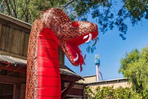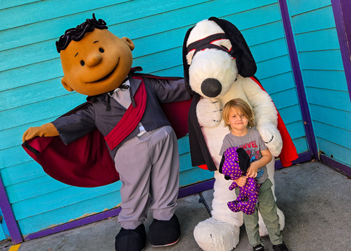 One thing that does creep from Scary Farm into Spooky Farm is the seasonal specialty food and drink. We tried many of the Scary Farm foods at a preview event (scan the QR code attached to this story to see the full food review) but getting to enjoy the full menu item in the daytime, when you aren’t pressed to run from one maze to the next, is even more enjoyable. The best of the seasonal foods is the Monster Mash – red wine braised beef pot roast over creamy mashed potatoes – from Boardwalk BBQ. We enjoyed it in the small taster on media night, and it’s even better full sized at Spooky Farm. Plus, Snoopy was holding an impromptu meet-and-greet right outside the restaurant, which drew kids in to see.