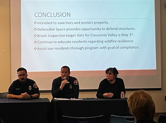 The Crescenta Valley Town Council (CVTC) hosted the Los Angeles County Fire Dept. on Tuesday night at the La Crescenta Library community room to discuss the expanded distribution of the revised annual brush clearance notices.
