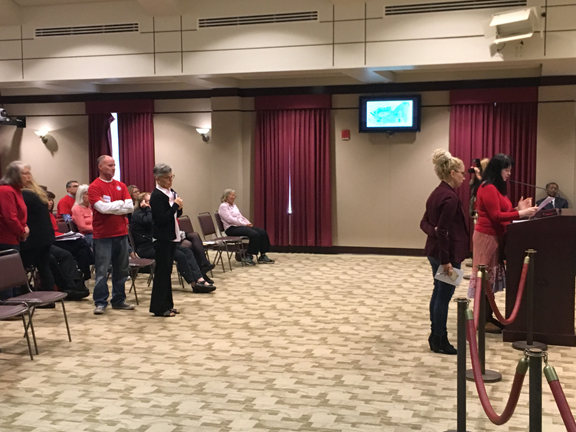 At the May 23 meeting of the LA City Planning Commission, opponents of the development of the former Verdugo Hills Golf Course property stand in line to address the Commission.