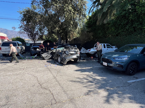 A single vehicle traveling southbound on the Angeles Crest Highway drove through the intersection at Foothill Boulevard and into the parking lot of Hill Street Café at about 2 p.m. on Wednesday. The vehicle collided with six parked vehicles. None of the parked cars were occupied at the time. The driver of the vehicle that struck the cars was transported to the hospital with unknown injuries. No other injuries were reported. The investigation is ongoing.