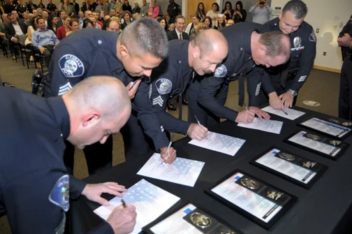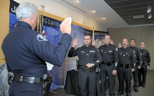 Glendale Police Chief Ron de Pompa welcomed the officers’ families to the afternoon ceremony and congratulated the recently promoted men after administering the oath.
