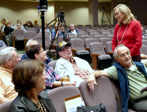 County Supervisor Kathryn Barger, standing, chats with attendees of the recent town hall meeting held to address upcoming weather concerns after the La Tuna Fire.