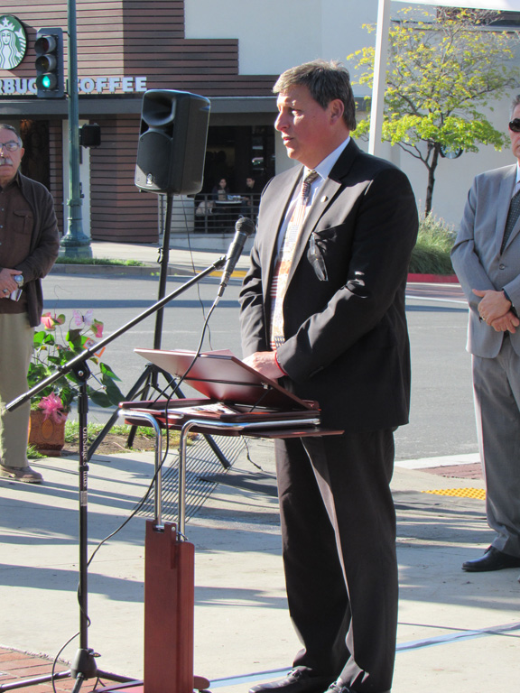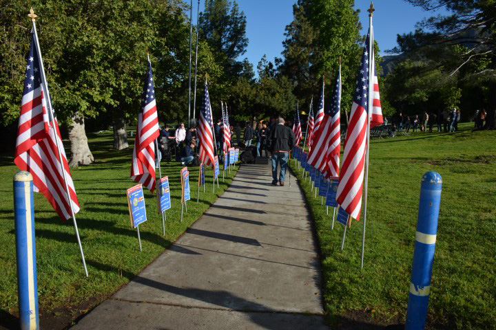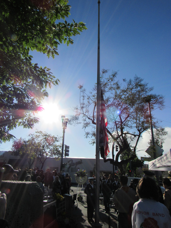 At the Two Strike Memorial Day observance, Darren Azarian presents a flag to WWII veteran Angelo Chairot in recognition of the sacrifice of his brother Roy.