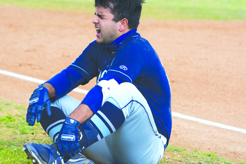 Noah Maddox grimaces in pain and grips his ankle after slipping on a wet base against Pasadena.