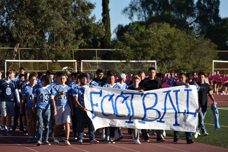 The evening started with a parade of the school groups that participated, including students from many of the athletic programs and performance arts. Following the parade, the senior and junior female members of the pep squad participated in a powder puff football game. The seniors ended up keeping the juniors scoreless, winning 24-0.
