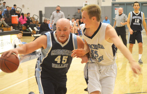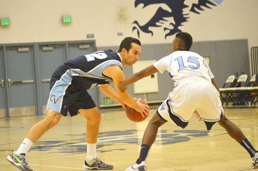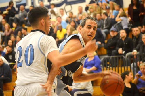 Greg Goorjian, guarded by Tadeh Tarverdians, looks for a shot in the Falcon alumni basketball game. Goorjian scored 14 points in the contest.