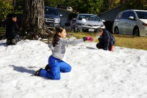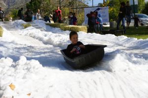 Last Saturday at Two Strike Park, families gathered for the treasured Winter tradition of playing in the snow. But in the Crescenta Valley, with temperatures comfortably in the 60°’s, playing in the snow is a rare treat. The Los Angeles County Department of Parks and Recreation hosted a Snow Day by having ice brought in and shredded into snow for local families to come and enjoy.