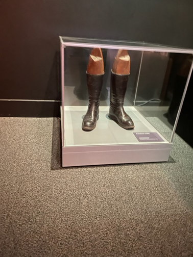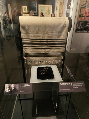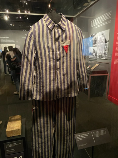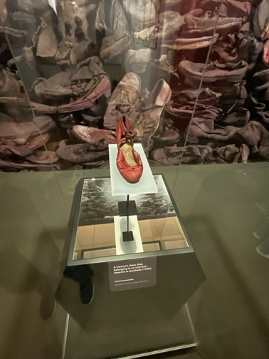 Around every corner of the exhibit is another artifact that takes one’s breath away: The blue and white, and gray and white, striped prisoner’s jacket and pants from the Sachsenhausen concentration camp, 1941. The photo of thousands of shoes that were left behind by those deported to Auschwitz, and then one single red shoe enclosed in glass in front of that photo.