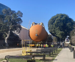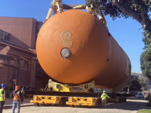 Because such a great length is required to store all of the rocket’s components, its movement to the construction zones was a procedure that lasted two hours to ensure the safety of onlookers and the moving crew. Museum volunteers, members and employees gathered to watch the tank roll past the Exposition Park Rose Garden as it traveled to its forever home. As the tank rolled into the sunlight and past the California Science Center sign, it encountered one last obstacle – the branches of a bay fig tree that was planted too close to the road and left no clearance for ET-94’s 27.5 foot diameter body. The Go For Stack safety crew countered this problem by laying down wooden pallets and plates of sheet metal to roll the massive tank up onto the sidewalk and around its adversary. On the bed of a specially made hauling vehicle, equipped with wheels that spun in all directions and two crew members remotely piloting each side of the machinery, team members from the family-owned business Bragg Companies succeeded in safely rerouting the tank’s course – just very very slowly.
