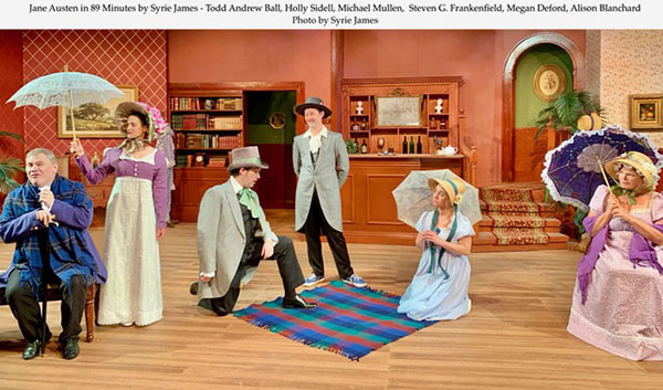 “Jane Austen in 89 Minutes” is a comedy in which a cast of madcap ladies and gents bring all six of Jane Austen’s beloved novels to comic life and includes modern day zingers about Jane Austen’s fame, fandom, movies and TV series. The play takes place in a wrinkle in time, the present day intermingled with England’s Regency Era, 1811-1816. At several points, Jane Austen must rein in her characters when they run amok and try to take over the show.