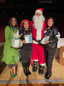 Pictured left are Dr. Darneika Watson, GUSD superintendent, Diana Hernandez, principal of Cerritos Elementary School, and Jill Welton, president and CEO of Glendale Memorial Hospital and Health Center, helped Santa Claus deliver wish list items for students at Cerritos Elementary School.