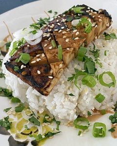 “The secret is to use organic firm tofu. It has a meaty texture and doesn’t disintegrate on the grill. I make cuts that crisscross the tofu and brush a sauce of tamari, rice vinegar, Sriracha, garlic and ginger into the cuts before grilling. I’ll make it sometime for you and Linda. I think you’ll like it!”