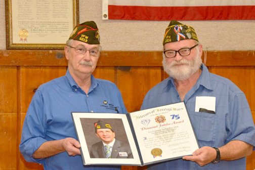 In other news, the commander-in chief of the Veterans of Foreign Wars of the United States of America presented VFW Post 1614 in La Crescenta with a congratulatory Diamond Jubilee Award for 75 years of service to local veterans and youth in the community. District 7 Commander Gary Mitchell presented the award to Post 1614 Past Commander Warren Spayth, USMC and Vietnam veteran.