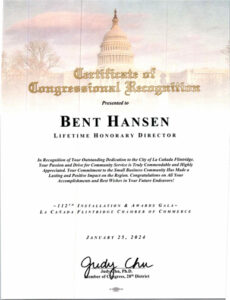 On Jan. 25 the La CaƱada Flintridge Chamber of Commerce presented Bent Hansen with a Lifetime Honorary Directorship. He is only the fourth person to receive this honor.