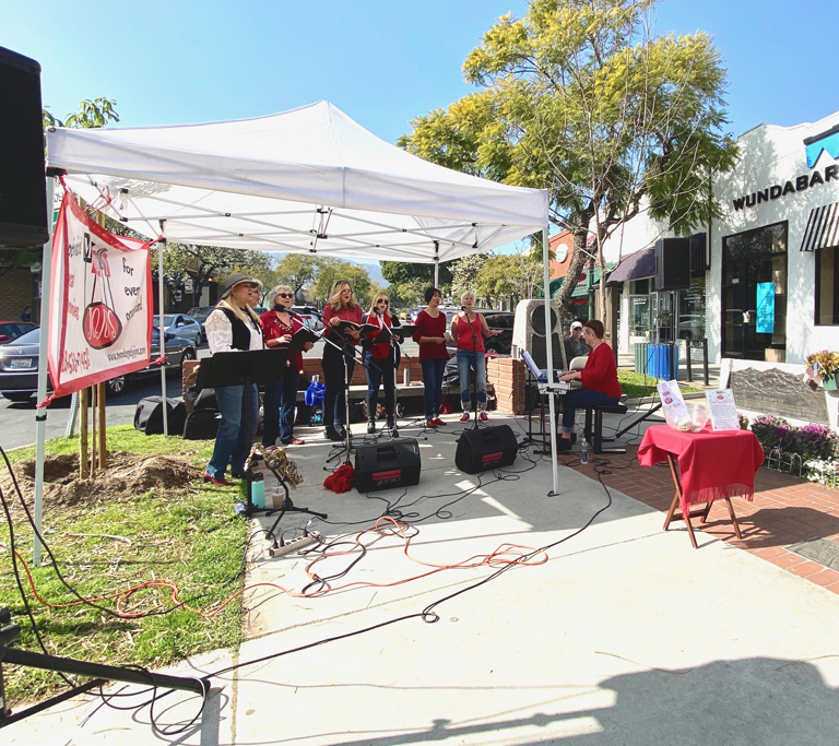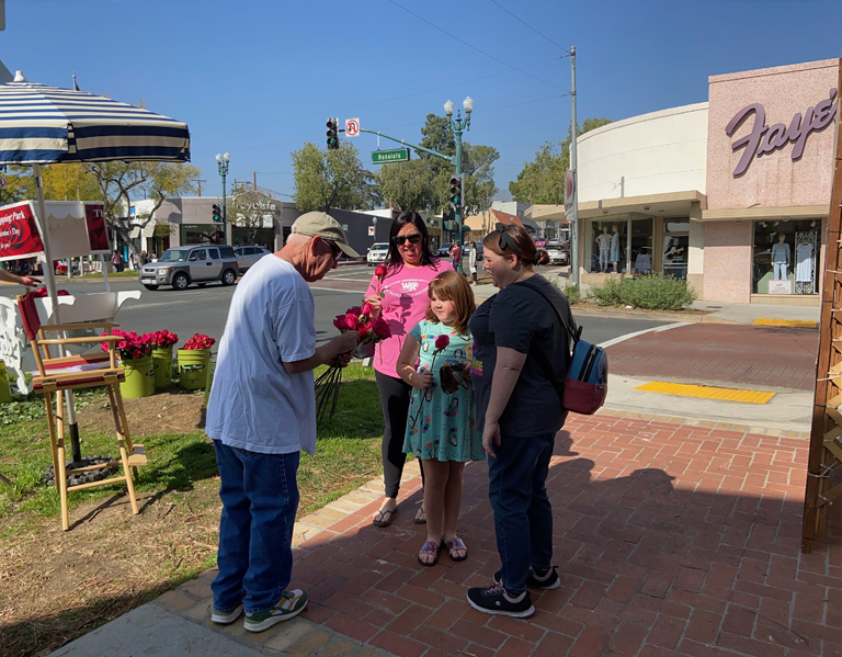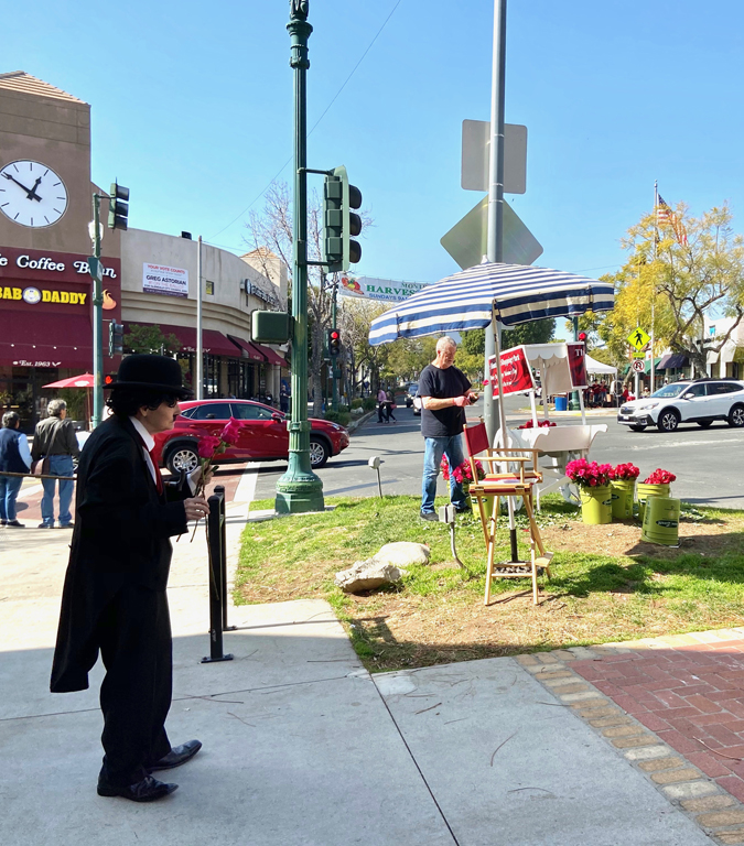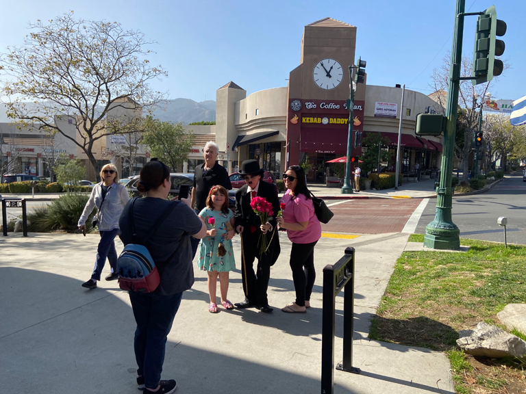 Sponsored by the Montrose Shopping Park Association, there was a large rose cart at the southeast corner of Ocean View Boulevard and Honolulu Avenue, along with a special photo opportunity. Handing out the long stemmed beauties was Charlie Chaplain, aka Audrey Ruttan, a Valentine staple in the shopping park.