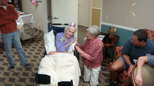 Mary Ayling shares a moment with her grandson Dale at her 106th birthday party.