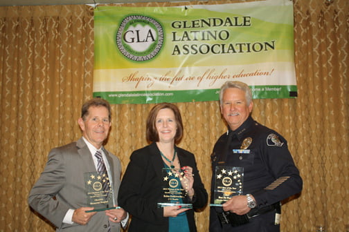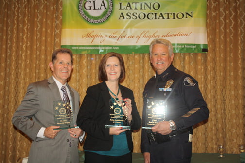 Honored by the Glendale Latino Association were (from left) Jack Ivey accepting for Business of the Year Glendale Memorial Hospital, Robin Goldsworthy of the Crescenta Valley Weekly and Ron de Pompa, chief of the Glendale Police Dept.