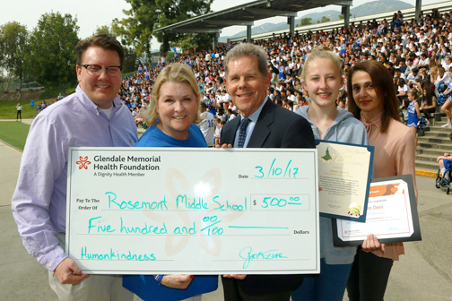Claire Davis of Rosemont Middle School won the 2017 Great Kindness Challenge Video Competition sponsored by Dignity Health – Glendale Memorial Hospital. Officials from Glendale Memorial presented Rosemont MS with a $500 award. Additionally, Claire received a commendation from Glendale City Mayor Paula Devine and award certificate from the hospital.