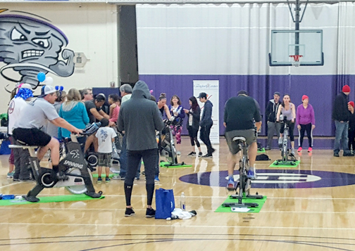 On Feb. 26, The Campbell Center (TCC) held its inaugural bike race event at the Hoover High School main gymnasium to raise funds for its mission. With music blaring, courtesy of super DJ Shai’La whose mix of songs had everyone hopping, singing along and dancing to the beat, nearly 100 participants, cheerleaders, spectators, TCC clients, board members and volunteers filled the gym. Their energy fueled bikers who pedaled their way to the finish line. Each biker rode as part of a team and also competed for their own individual place as well as their team’s prize. Prizes were awarded for most dollars raised and most miles pedaled. While friendly in spirit, the competing bikers were serious about their 20 minutes on the bike and gave it their all.