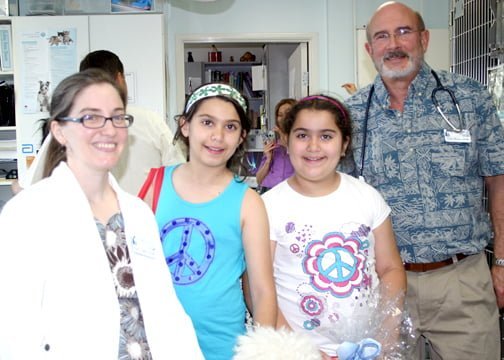 CVVH veterinarian Keri Franco DVM with open house visitors fourth grader Solange and sister Sharleese Eurodijian with (standing) veterinarian Thomas Black DVM.