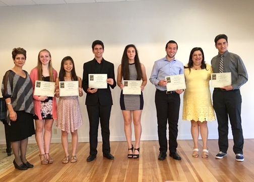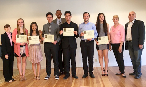 Pictured are (from left) are Deanna Alfeld (scholarship chair) Emily Novak (CVHS), Amy Choi (CVHS), Arvin Sarkissian (Clark HS), Christian Daly (from Kathryn Barger’s office), Arin Sarkissian (CVHS), John Bandek (Clark HS), Noor Alanizi (CVHS), Marianne Jennings (LCWC president), Harry Leon (CV Town Council president).