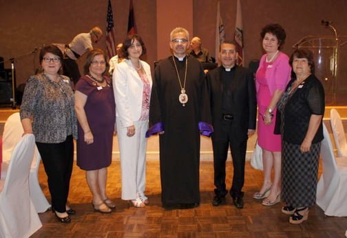 At the June 4 luncheon were (from left) Liza Santikian, Armenouhi Tomassian, Lena Bozoyan, Archbishop Mardirossian, Rev. Fr. Razmig Khatchadourian, Christina Khanjian and Karine Barikian-Setian.
