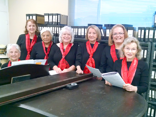 Shown is Sharon Schlarb, director, at the piano and standing from left are Marianne Jennings, Rosa Frommer, Jeanne Long, Judi Mc Clure, Ginney Pruitt and Mia Lundergan.