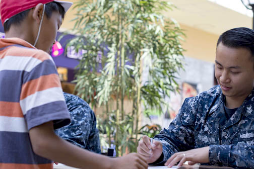 Personnel Specialist 1st Class Boonyarit Panavaravatn from Glendale is shown speaking with a fifth grade student from Terao Elementary School. The students visited NAF Atsugi to practice English with sailors as part of a recurring community service project.