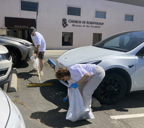 “We see the parking lot daily and decided it needed some attention,” said Stacy Kitchens, executive director of the Church of Scientology Mission of the Foothills. “We plan to do this again on July 20 and we invite others to give a hand – if we have enough help, we’ll branch out to nearby areas.”