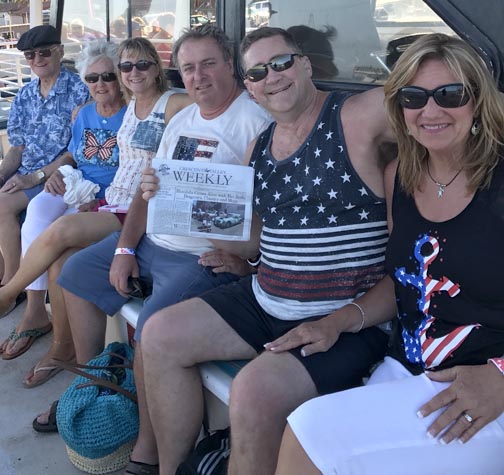 CV Weekly recently traveled to Maui with Jamie Holler, right, and Chuck Holler (holding CV Weekly). With them were John Beeks, Barbara Holler, Janine Easley and Jay Easley. They’re shown on the Discovery Catamaran through the Pacific Whale Foundation in Lahaina Harbor on July 4th waiting for fireworks to begin.