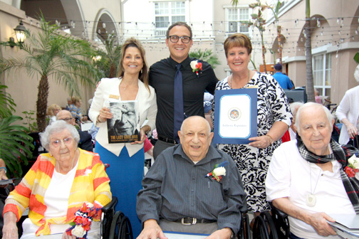 Belmont Village Senior Living Burbank held an opening reception recently for the new photography exhibit called “American Heroes: Portraits of Service,” which features the images and stories of WWII-era veterans. Each resident veteran was presented with a copy of photographer Thomas Sanders’ book, “The Last Good War: The Faces and Voices of WWII” and a certificate of appreciation from California Assemblyman Mike Gatto. Shown in the front row are WWII veterans Mildred Evans, Lee J. Broussard and Samuel “Ed” Robinson; in the back row are (from left) Michelle Sucillon, Belmont Village community relations; photographer Thomas Sanders and Mary Jane Rodriguez, Belmont Village executive director. The public is welcome to view the permanent gallery, but is asked to call (818) 972-2405 for an appointment.