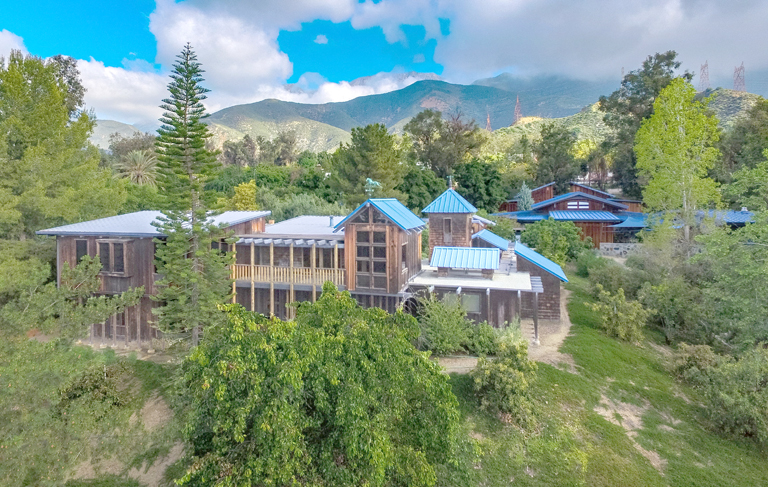 An aerial view of the historic home of Sam and Alfreda Maloof and the Jacobs Education Center Gallery.