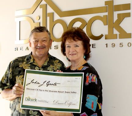 Brenda & John Grote were the winners of Dilbeck Real Estate’s Discover California drawing. They won a golf & spa package that included a weekend for two at the Silverado Resort in the Napa Valley. They will enjoy a relaxing get-a-way that includes three days and two nights playing golf, relaxing with spa treatments and wine tasting in the Napa Valley. John said they “are already looking forward to a relaxing weekend.”
