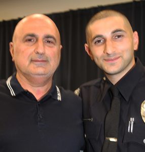 Newly sworn-in GPD Officer Arthur Haroutunian is congratulated by dad Panos.