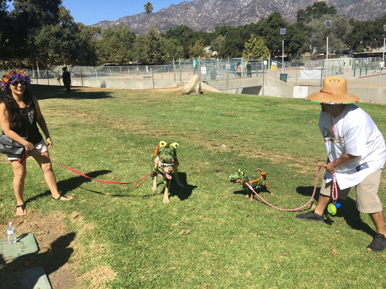 Many of the dogs came dressed in costumes for the costume contest, so it looked like the park was filled with a menagerie of animals, such as a pink flamingo, unicorn, shark, turtle, alligator, lion, a Woodstock hippie (named “Spirit Kennedy”) and several Halloween costumes like a witch and ghoul.