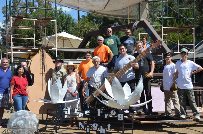 This year’s float, Tree Frog Night, features three musically talented frogs, two fish, a ladybug and dragonflies. The float is tall this year, measuring 23’ 6” high and 50’ long. It is the only float in the parade built and decorated entirely outdoors.