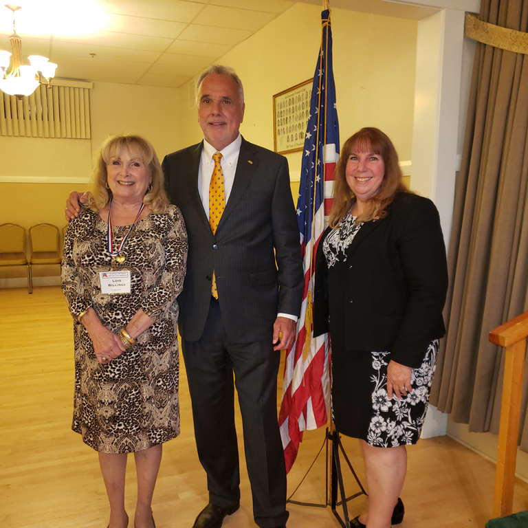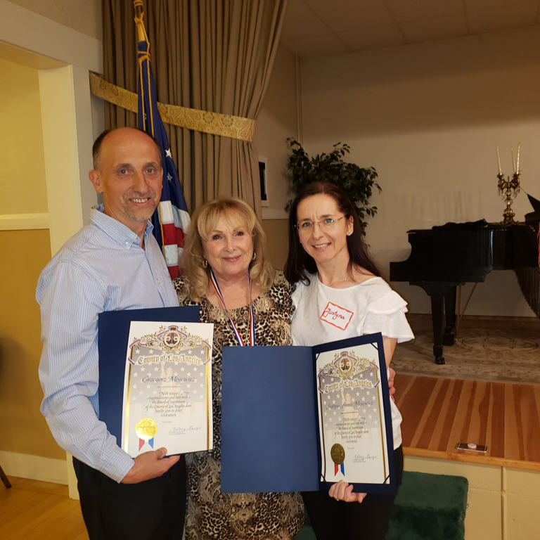 Newly naturalized American citizens Justyna Anna Misiewicz and Grzegorz Misiewicz (above right) were honored with the presentation of congratulatory scrolls signed by Hon. Kathryn Barger, Los Angeles County Supervisor, and presented by President Lois Billings.