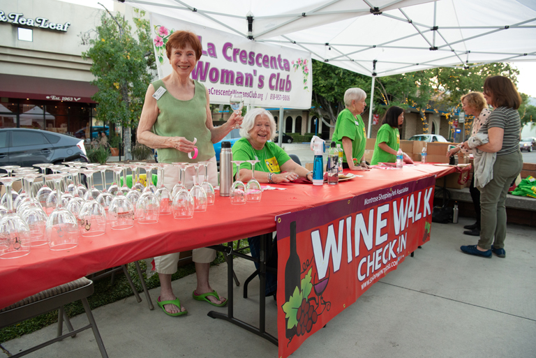 Walkers first stopped at the corner of Ocean View Boulevard and Honolulu Avenue where members of the La Crescenta Woman’s Club handed out wine walking gear: a souvenir wine glass, pour tickets, a wristband, map of all participating merchants and $10 in Montrose scrip. All were packaged in a bright red and white tote.